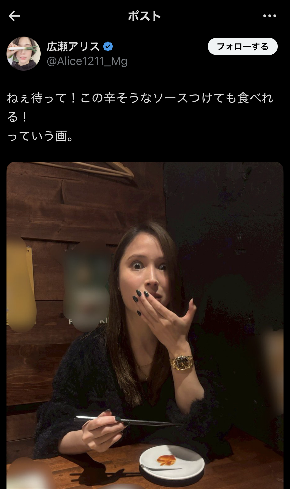 - 3月18日:広瀬アリスさんが食事中の驚いた表情の写真を投稿。「ねぇ待って!この辛そうなソースつけても食べれる!っていう画。」とコメント。 asajo.jp