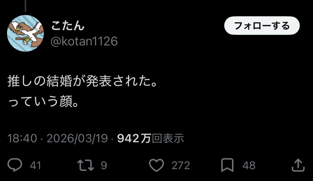 - これに対し、一般ユーザーから「推しの結婚が発表された。っていう顔」というリプライが来る。