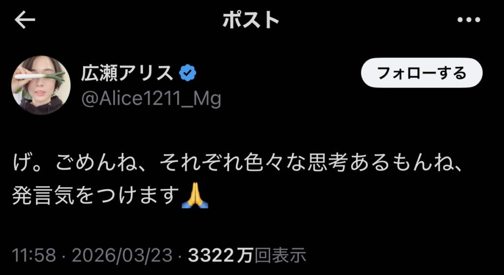 - 3月23日:広瀬さんが「げ。ごめんね、それぞれ色々な思考あるもんね、発言気をつけます」と短文投稿。