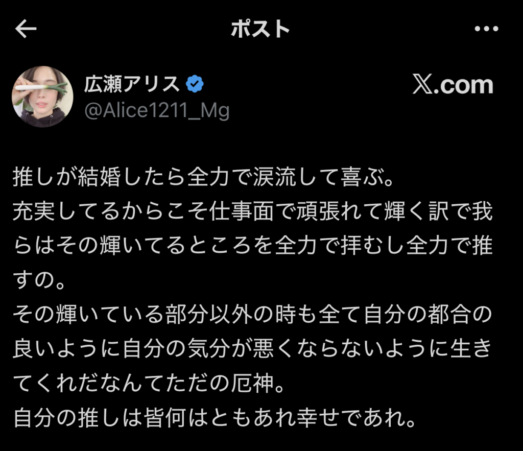 「推しが結婚したら全力で涙流して喜ぶ。充実してるからこそ仕事面で頑張れて輝く訳で我らはその輝いてるところを全力で拝むし全力で推すの。その輝いている部分以外の時も全て自分の都合の良いように自分の気分が悪くならないように生きてくれだなんてただの厄神。自分の推しは皆何はともあれ幸せであれ」